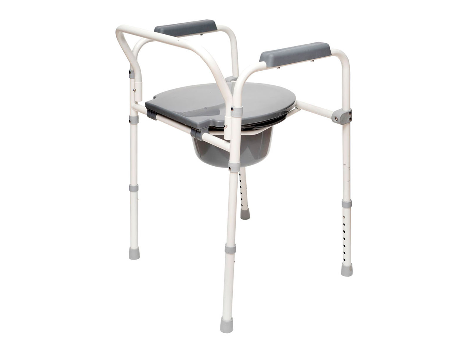 Уход и рекомендации: устанавливайте кресло-туалет на ровной поверхности, регулярно очищайте съёмное ведро и сиденье с мягкими дезинфицирующими средствами. Проверяйте состояние резиновых наконечников и заменяйте их при износе. Избегайте воздействия прямых солнечных лучей и нагрева.