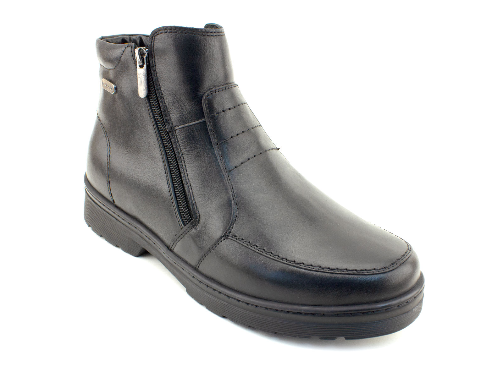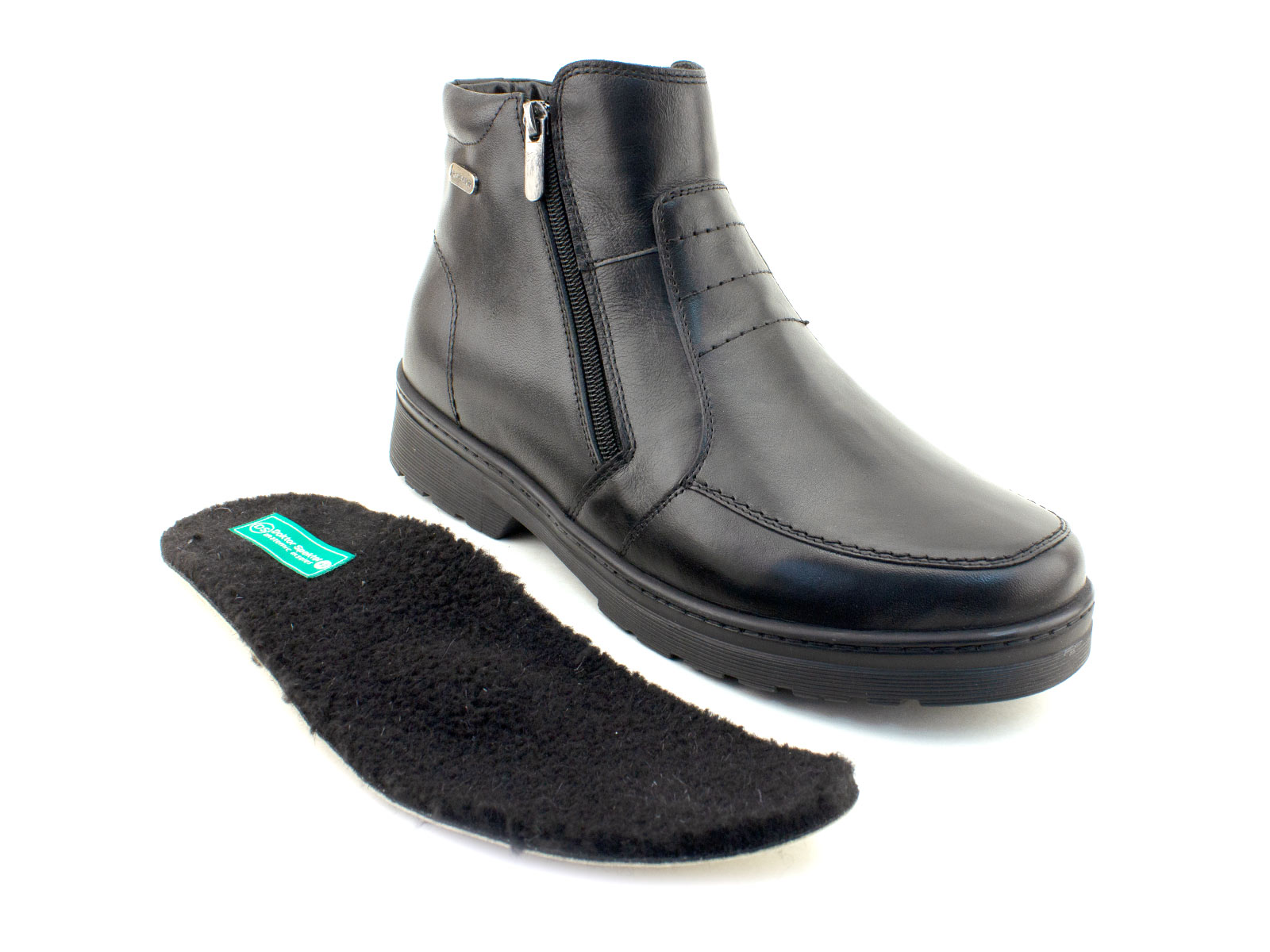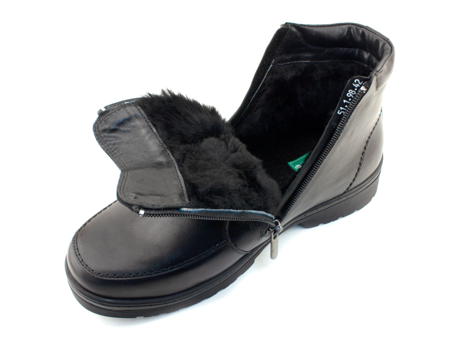 Ботинки изготовлены из натуральной кожи и дополнены подкладкой из меха, что гарантирует воздухообмен и комфорт даже при длительном ношении. Подошва из износостойкого ТЭП обеспечивает амортизацию и устойчивость на скользких поверхностях. Съемная стелька с меховым покрытием позволяет регулировать объем и гигиеничность обуви. Две молнии по бокам облегчают надевание и фиксацию, а жесткий задник поддерживает правильное положение стопы, предотвращая деформации.